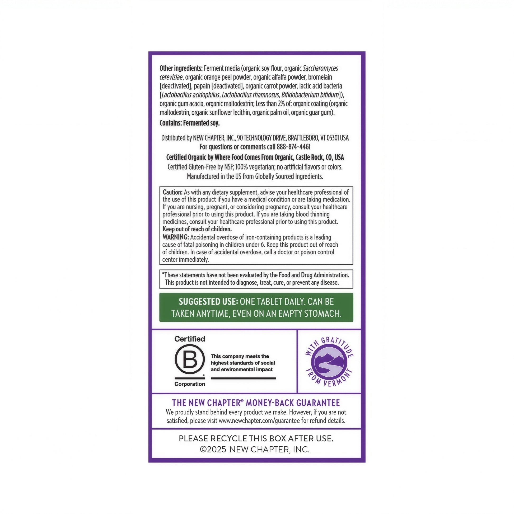 Since our beginning in 1982, New Chapter has been fiercely committed to delivering excellent quality–every ingredient, every product, every time. You can rest assured that our ingredients meet the strict safety and purity requirements set by the FDA (Food & Drug Administration), Health Canada, and California Prop 65.